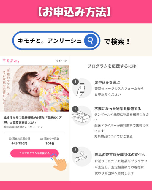 応募方法:「キモチと」に不用品を寄付し、下記方法にてアンリーシュにご連絡ください。