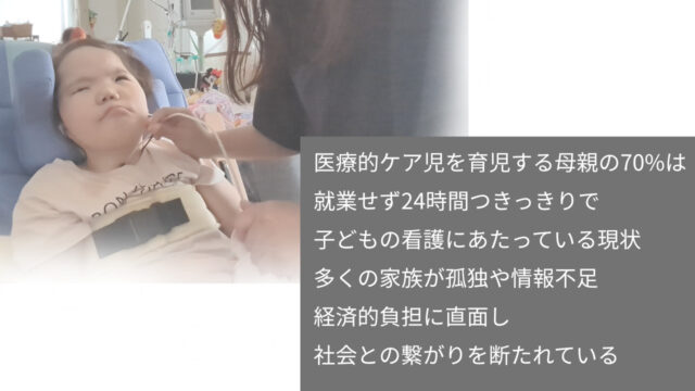 さらに、多くの保育園や幼稚園では、経管栄養など医療的ケアが必要な子どもの受け入れが難しく、「預け先がないために働けない」という母親が多数存在しているのが現状です。
